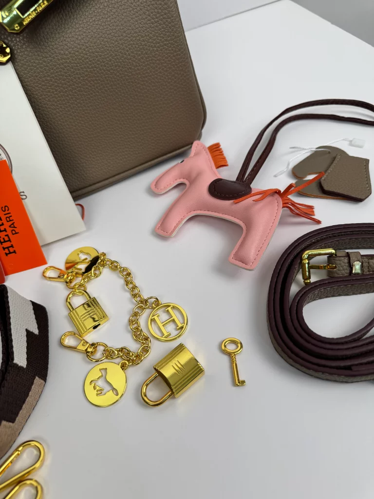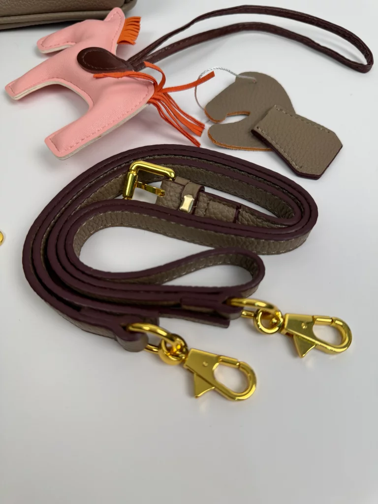 دارای بند بلند چرم و بند پهن اسپرت، آویز اسب و اکسسوری فلزی و چرمی
