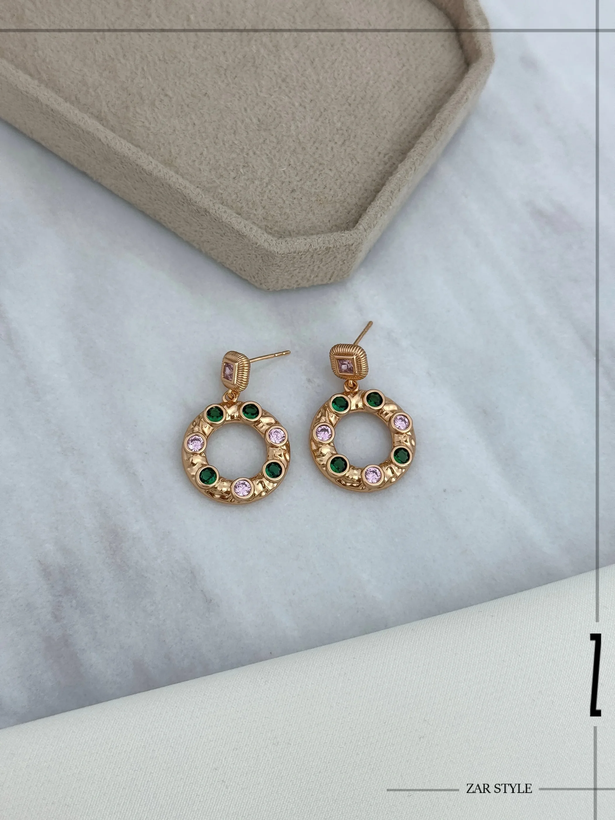 گوشواره حلقه‌ای نگین زمردی و صورتی